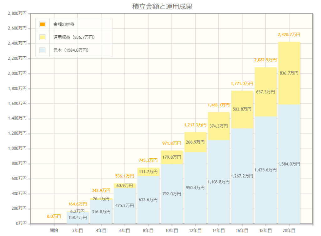 このグラフから20年で実際に納めた額は1584万円ですが、複利の力で836.7万円もプラスされます!